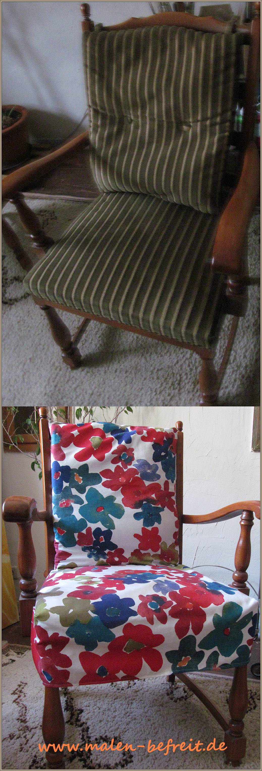 Streichen ginge immer noch, aber ich glaube, das ist gar nicht mehr nötig. Ich finde, der Stoff peppt schon genug auf, ich mag die neuen alten Stühle jetzt sehr gern!